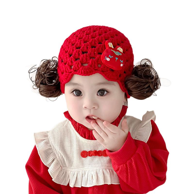 Red Knitted Baby Girl Princess Wig Hat - Festive New Year Wool Hat