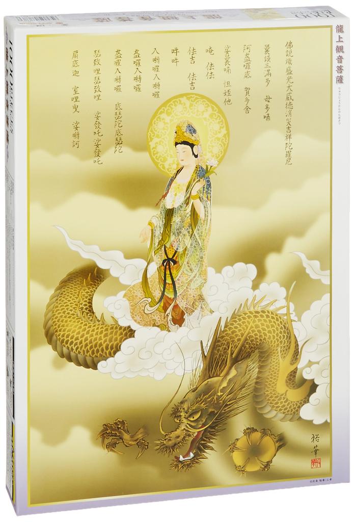 Since ancient times, dragons have been worshipped as gods of fertility who bring rain, and as they firmly grasp a wish-granting jewel symbolizing wealth and good fortune, driving away all misfortune with their majesty. Kannon Bodhisattva, who appeared from the far western Pure Land, is said to transform into 33 different forms to save people suffering from various hardships, and it is said that praying to this figure will turn nightmares into good fortune. In the background is a sutra called "Shozai Ju," which says that all disasters and misfortunes that befall one will be wiped away. This is a sublime painting of good fortune and warding off evil, depicting Kannon Bodhisattva riding on a five-clawed dragon god, considered the highest ranking, appearing to save all living beings in a dignified manner. (C) Hojo Yuka/Sanko