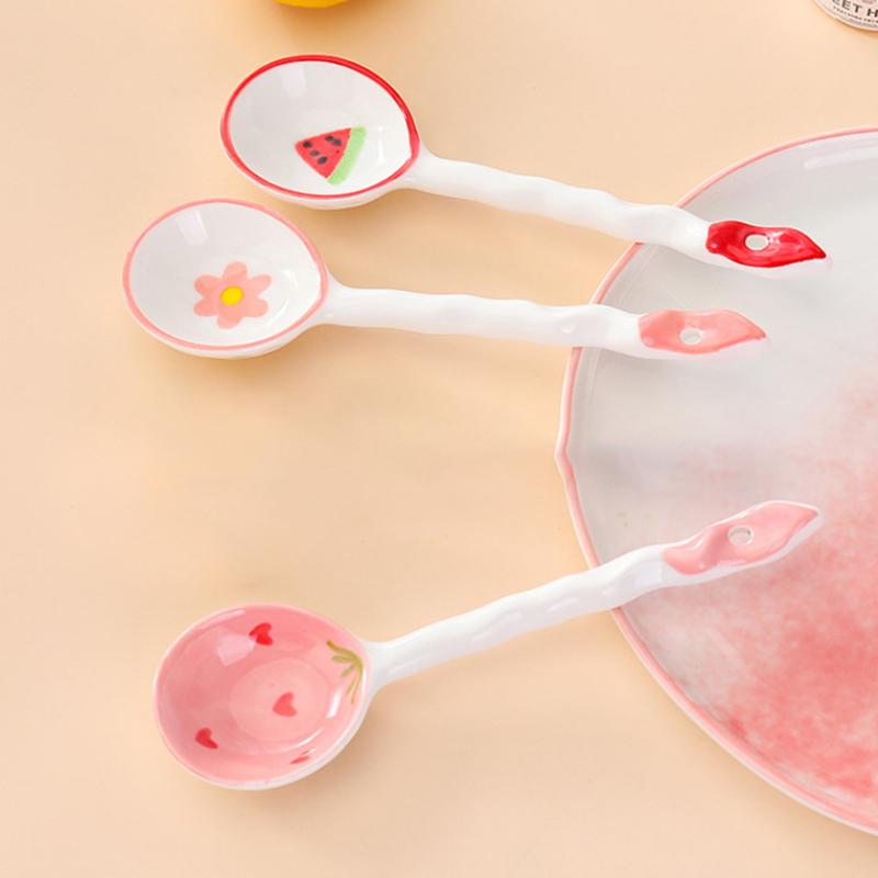 Кавайный Фруктовый Клубничный Керамическая Суповая Ложка Милая Ложка для Мороженого Ручной Росписи для Кофе Десерта с Длинной Ручкой Кухонные Аксессуары