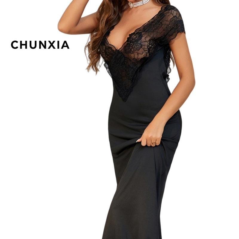 Стиль чистого желания длинная ночная рубашка женская сексуальная V-образный вырез кружево короткий рукав разрезы пижама одежда для дома