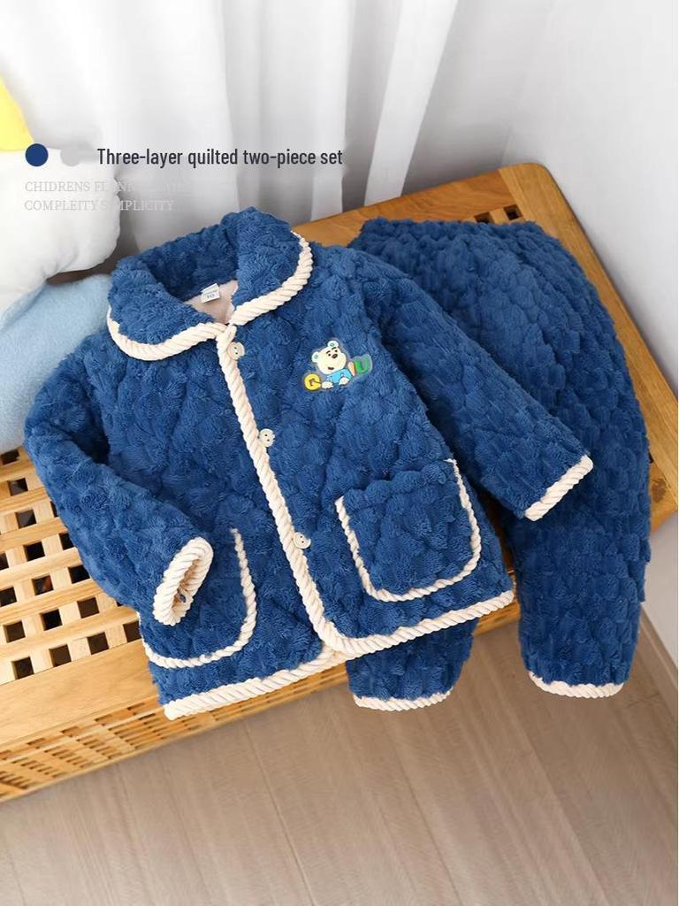 Kids' Winter 3-Layer Quilted Pajamas Coral Fleece Set - Boys, Girls, Babies & Parent-Child Outerwear