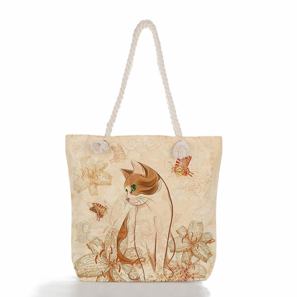 Cartoon cat print thick rope single-shoulder beach bag 7252