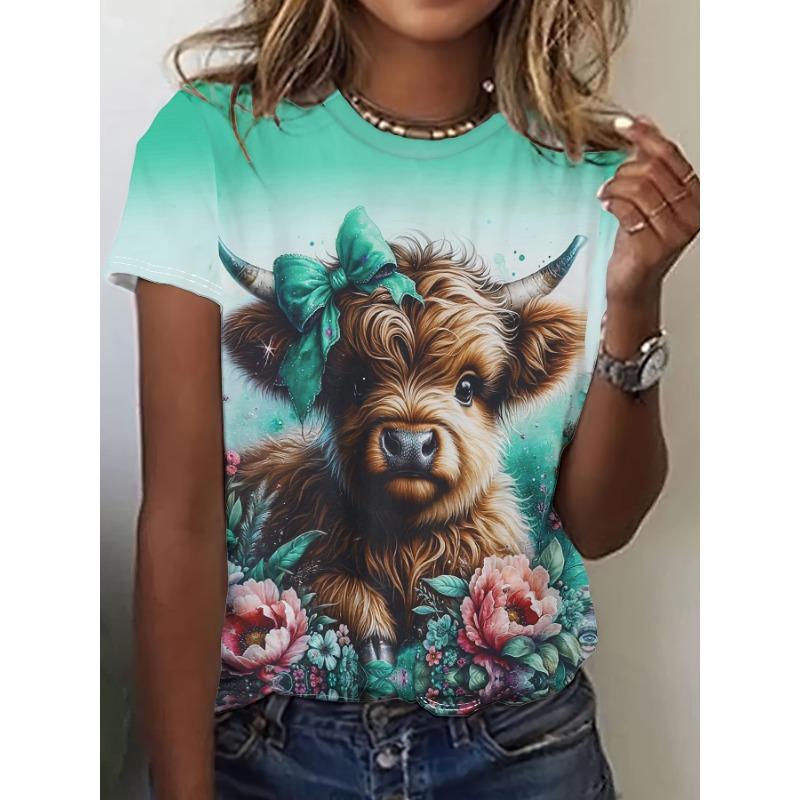 Women's Casual High Neck T-Shirt Summer Floral & Highland Cow Print Breathable Washable