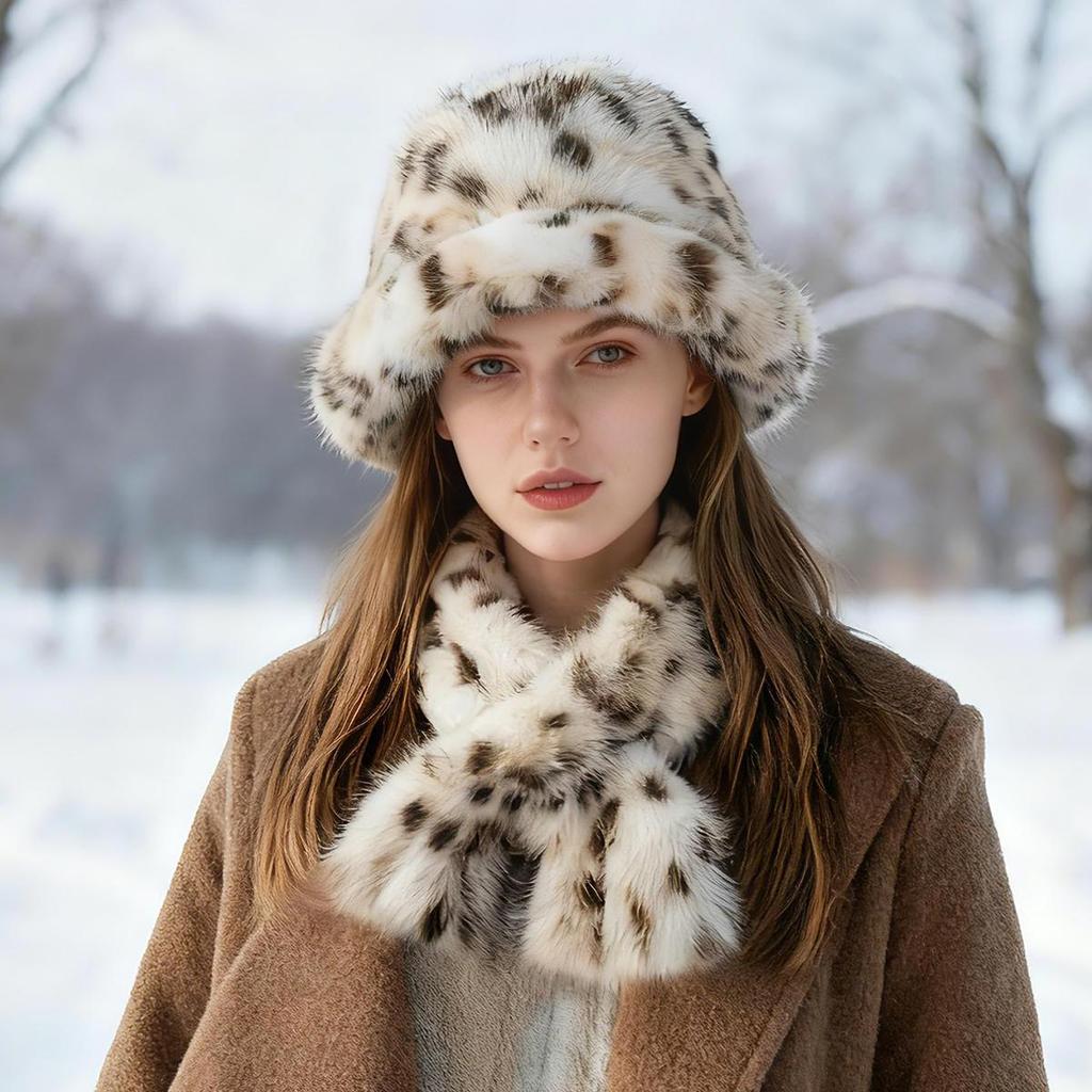 Женский набор: шапка-ведро и шарф из искусственного меха норки, классический леопардовый принт, теплый набор из веганского искусственного меха, шапка и шарф из искусственного меха для зимы