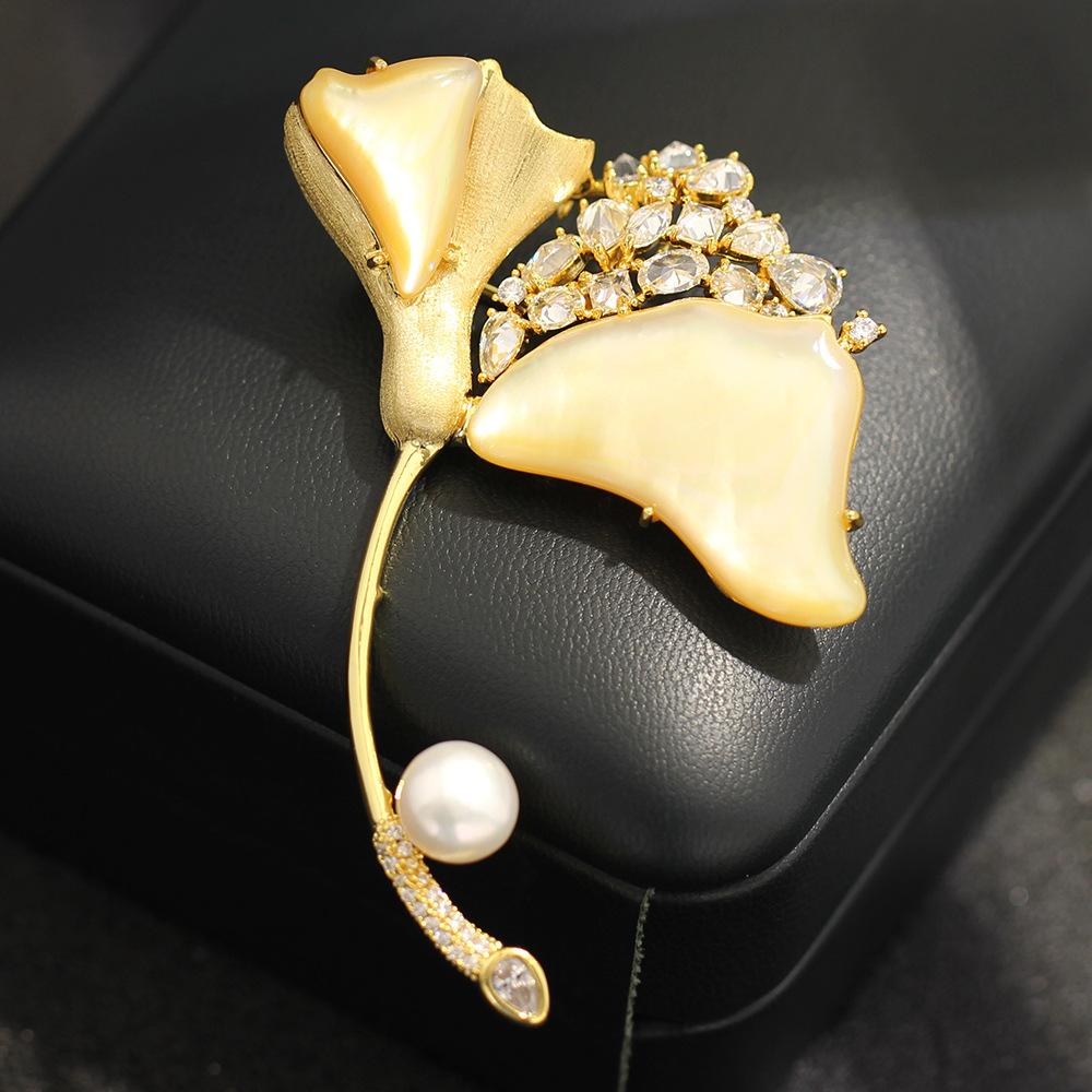 Jewelry High-end Natural Yellow Fritillary Ginkgo Biloba Brooch Elegant Light Luxury Freshwater Pearl Diamond Leaf Pin Female — купить товар онлайн с бесплатной доставкой по всему миру!