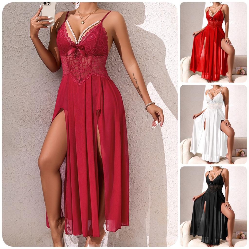 Кружевная жемчужная комбинация для сна с глубоким вырезом и высоким разрезом, прозрачная сетка, длинная, сексуальная женская одежда для дома 898, женственная, смелая одежда для сна с романтическими цветочными деталями — купить товар онлайн с бесплатной доставкой по всему миру!