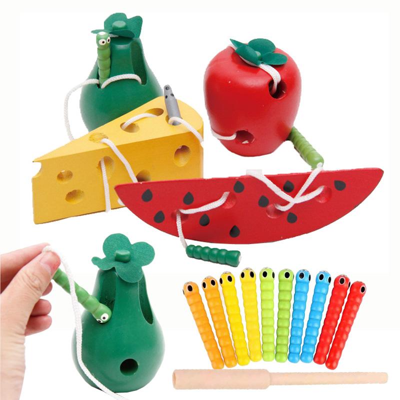 Используйте деревянных жучков для проделывания отверстий, развивайте гибкость пальцев малыша и координацию движений рук и глаз; позвольте ребенку поочередно продевать деревянных жучков через отверстия в фруктах, это нельзя повторять или ронять; пусть ребенок использует деревянных жучков, чтобы проходить через маленькие отверстия в направлении, противоположном только что использованному, пока веревка не будет развязана. В процессе игры мы можем вместе с малышом придумать интересную историю, увеличить удовольствие от игры и развить разговорные навыки малыша.. Например, в истории может говориться: """Жук голоден, он хочет есть яблоки, жук жует и жует, и выжевывает дырки""". Жук так счастлив, играет в прятки в норке; Когда насекомое сыто, становится темно. Насекомое вылезет из дырки в яблоке и пойдет домой. "