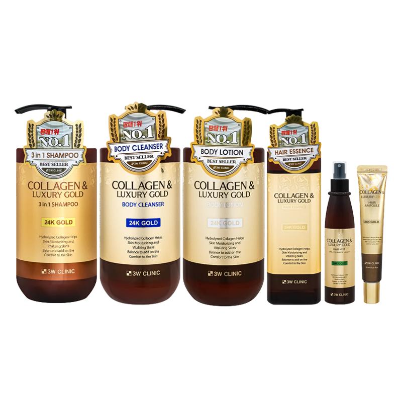 Коллекция 3W CLINIC Collagen & Luxury Gold Total Care — это премиальная линия ухода за телом и волосами, разработанная с использованием гидролизованного коллагена и 99,9% чистого 24-каратного золота для интенсивного увлажнения, повышения упругости и оживления от головы до кончиков пальцев ног.
