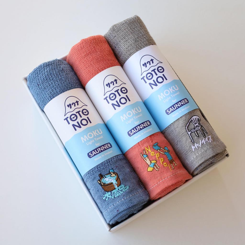 Подарочная коробка Сауна MOKU <60299-90> Полотенца для лица, Средний размер, Подарочный набор из 3 предметов: Холодная ванна (синий), Тепловая волна (Мандарин), и Тотоноису (Серый)