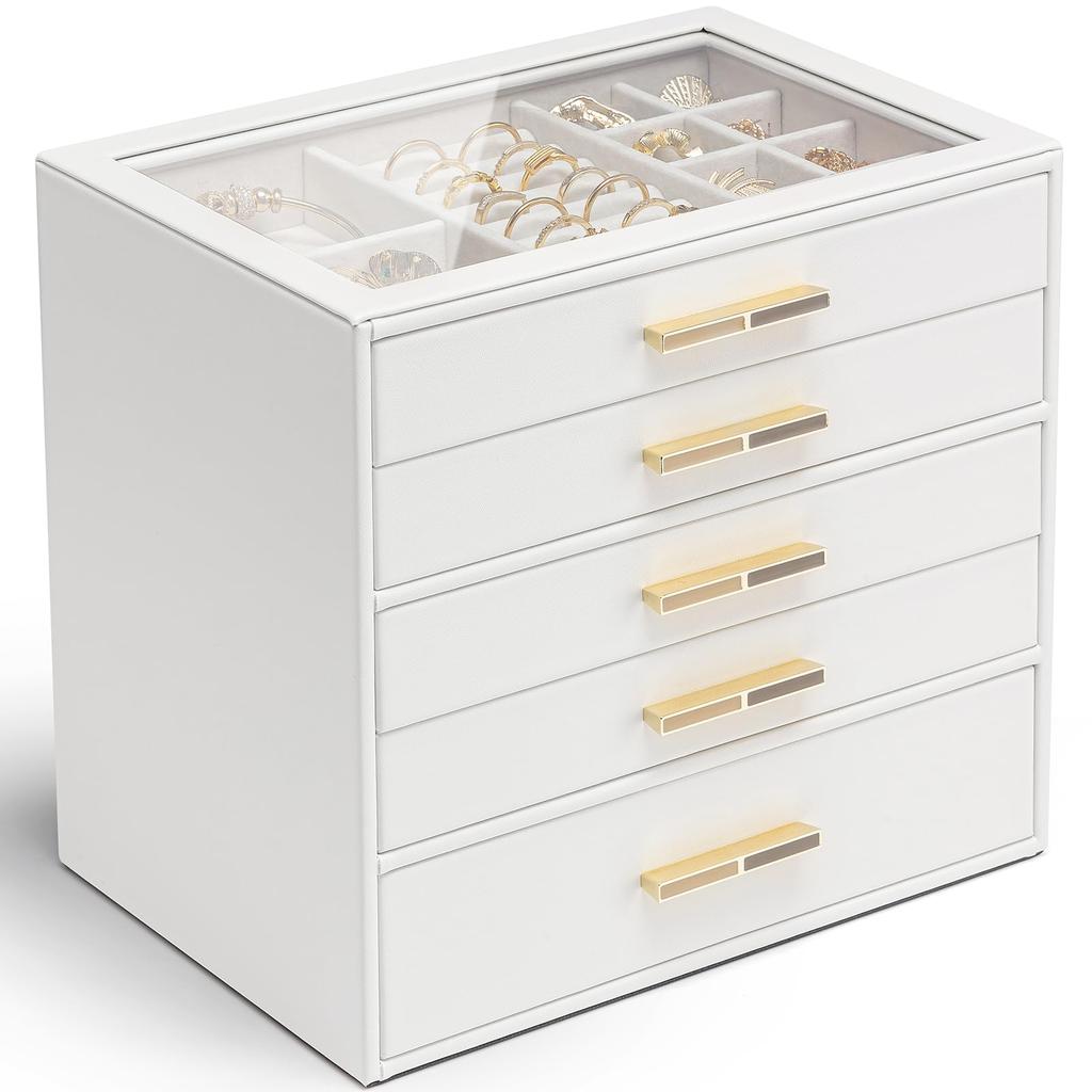 Vlando Стеклянная крышка 5-ящичковый шкатулка для украшений для женщин, Органайзер для ожерелий, колец, сережек, браслетов и аксессуаров (белый)