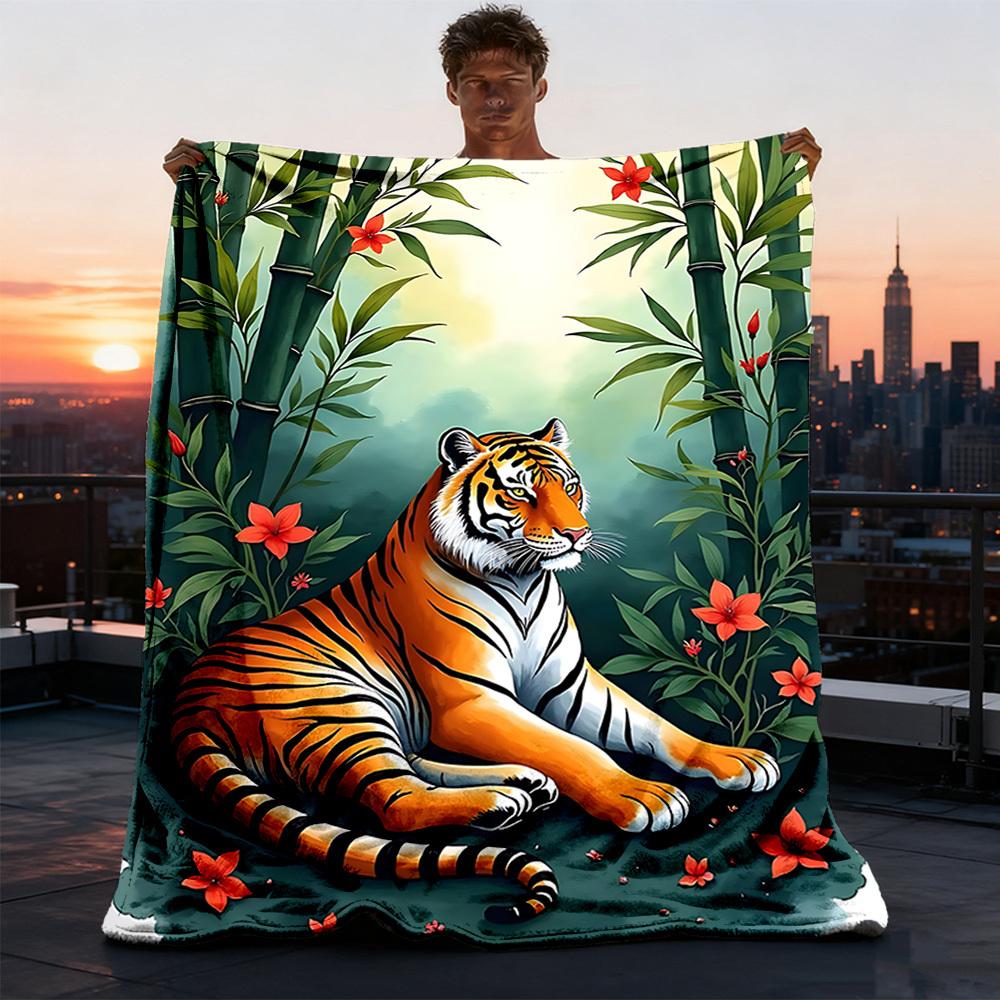 1pc Tiger Bamboo Flowers Throw Blanket Polyester Fiber, Lightweight Flannel, Soft & Warm, All Season Use for Outdoor, Camping Digital Print — купить товар онлайн с бесплатной доставкой по всему миру!