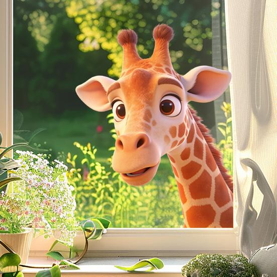 Очаровательные интерактивные дизайны: Демонстрирует очаровательные мультяшные изображения жирафов, которые как будто заглядывают через стекло или стену. Эти живые, причудливые формы добавляют игривости и душевности в любую комнату, мгновенно оживляя атмосферу своим ярким присутствием.