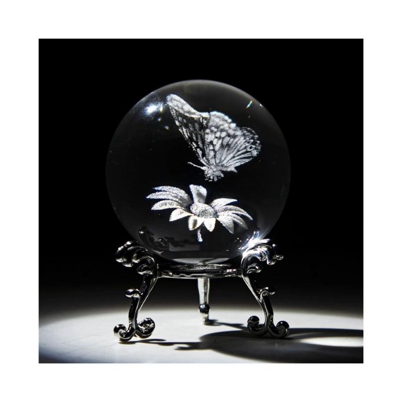 3D-Lasergravur Schmetterlings- und Blumenmotiv Kristall-Dekokugel, 60 mm Glaskugel Briefbeschwerer mit Sockel
