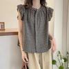 Женская черно-белая блузка в клетку гингем с оборками и короткими рукавами, свободный повседневный топ
