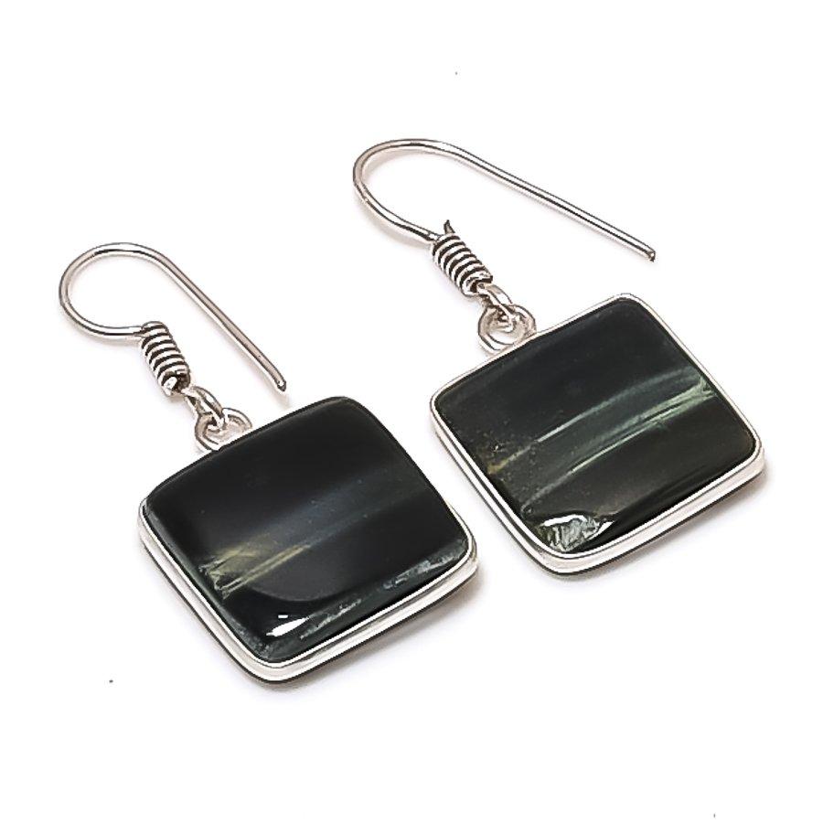 Натуральный Черный Тигровый Глаз Камень Ручной Работы Серьга из Стерлингового Серебра 925 пробы 1.38" AE-11471