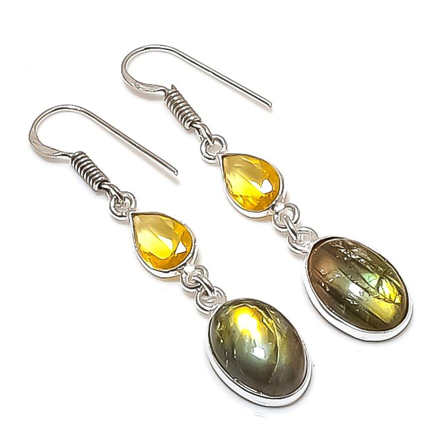 Натуральный Лабрадорит, Цитрин Камень 925 Стерлинговое Серебро Серьга 1,97" AE-11741