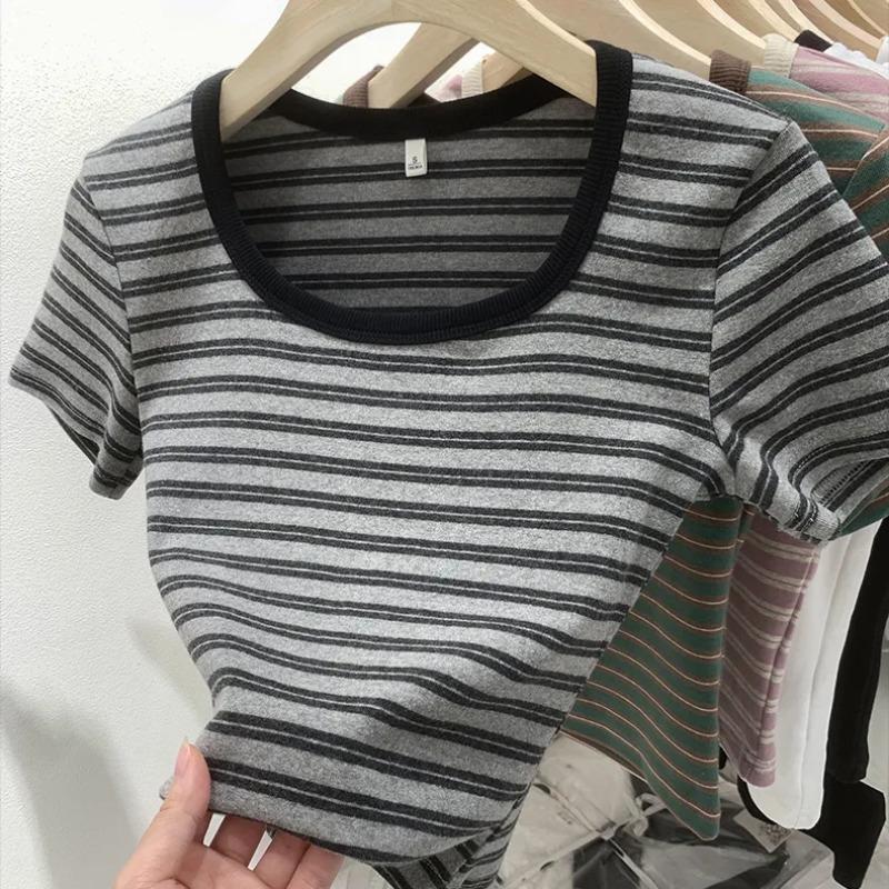Женская летняя новинка: полосатая футболка с квадратным вырезом и коротким рукавом, правое плечо, приталенная, с милым и дерзким характером, универсальный короткий топ — купить товар онлайн с бесплатной доставкой по всему миру!