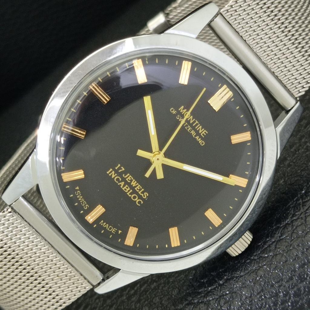 ШВЕЙЦАРСКИЕ ВИНТАЖНЫЕ МУЖСКИЕ ЧАСЫ MONTINE С РУЧНЫМ ПОДЗАВОДОМ, ВОССТАНОВЛЕННЫЕ, ЧЕРНЫЙ ЦИФЕРБЛАТ a441069-1 — купить товар онлайн с бесплатной доставкой по всему миру!