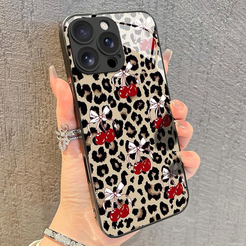 Закаленное стекло Чехол для телефона с принтом леопарда, бантом и вишней Для iPhone 17 16 Pro Max 15 14 13 12 11 Pro 16E 7 Plus XR XS X