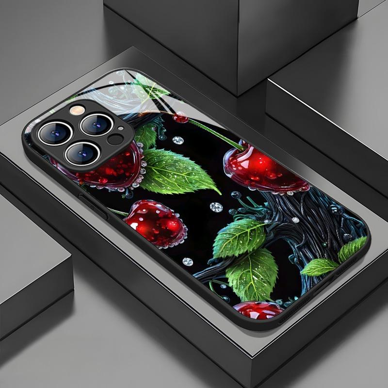 Стеклянный чехол для телефона с узором из вишни и зеленых листьев для iPhone 17 16 15 14 Pro Max 13 12 11 16E 17Air 7 8 Plus XR XS X