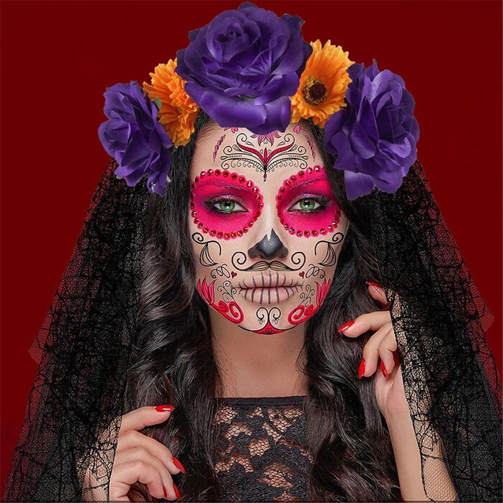 Ретро Цветок Мертвых Мексиканская Роза Цветочная Корона Повязка на Голову Гавайская Бохо Хэллоуин Цветок Розы Повязка на Голову Головной Убор для Женщин