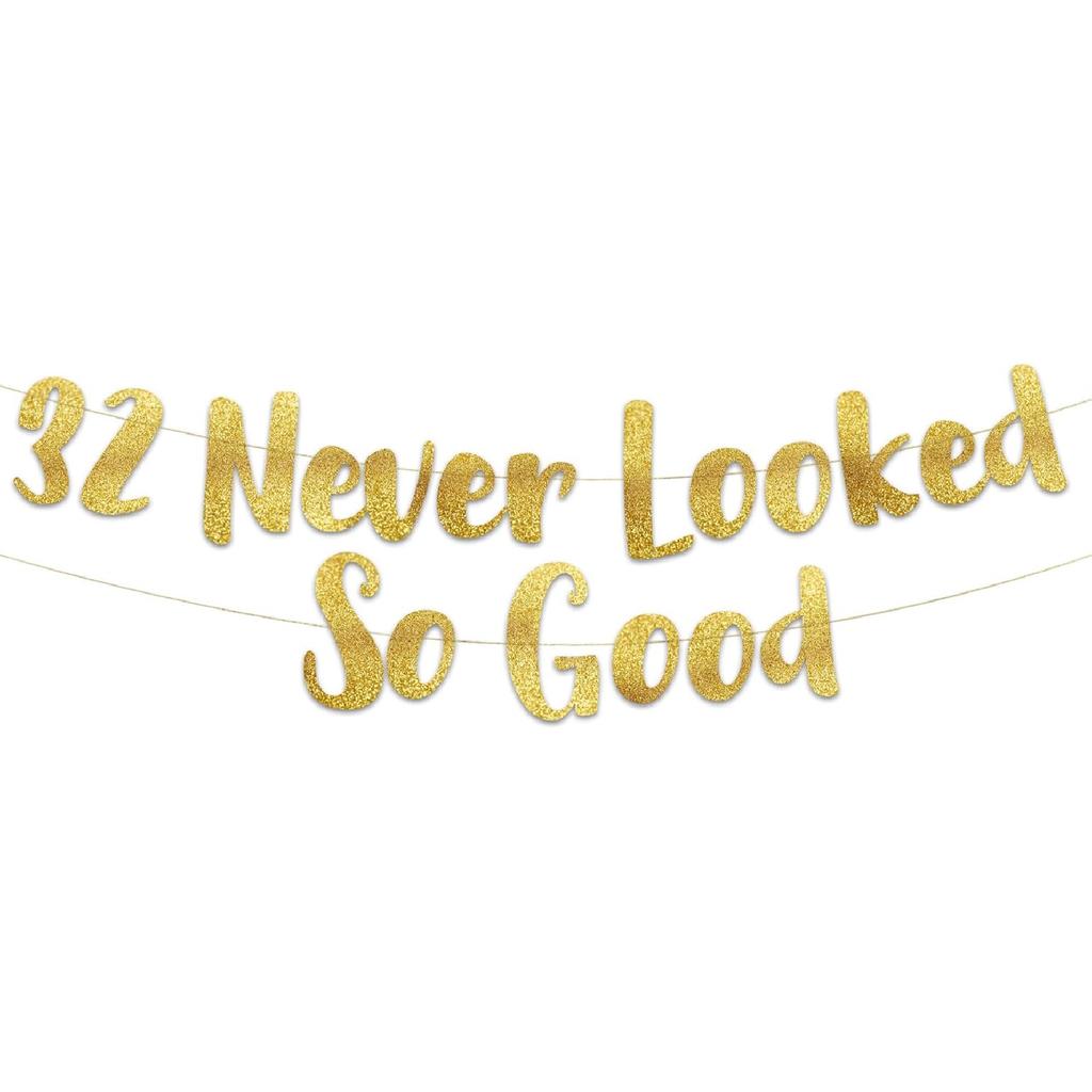 32 Never Looked So Good Gold Glitter Banner - 32nd Anniversary and Birthday Party Decorations