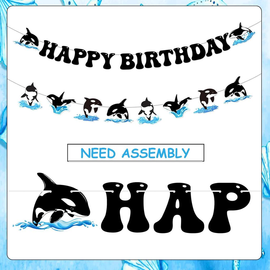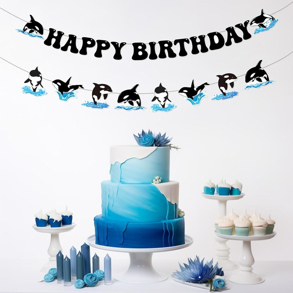 Orca Birthday Party Decorations, Whale Theme Happy Birthday Banner Killer Whale Theme Ocean Whale Garland DIY Craft for Under The Sea Birthday Party