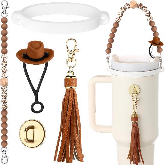 Skylety 5 Pcs Cowboy Hat Silicone Cup Accessory Set Compatible with Stanley Cups Includes Cow Hat Straw Cover Beaded Bottle Strap Leather Tassel