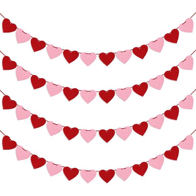 4 Pack Felt Heart Garland Banner, No DIY Valentine's Day Decorations Red Pink Hearts Hanging Banner 9.8ft Galentines Day Heart Felt Decor for Wedding