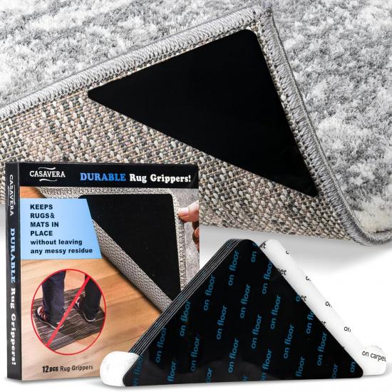 CASAVERA 12 Pcs Rug and Carpet Tape Grippers, Non-Slip, for Hardwood and Tile Floors, Durable Double-Sided Tape for Area Rugs, Adhesive Rug Stickers