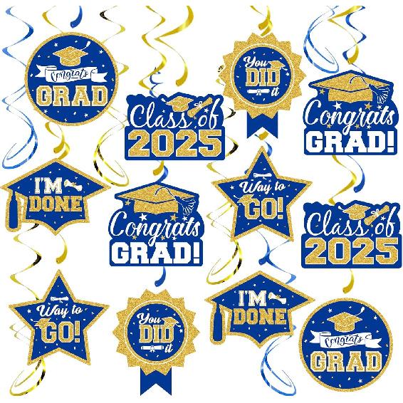 2025 Graduation Party Decorations - 30 Pcs Blue Gold Class of 2025 Congrats Grad Hanging Swirl Ceiling Decor for Home School Classroom Graduation