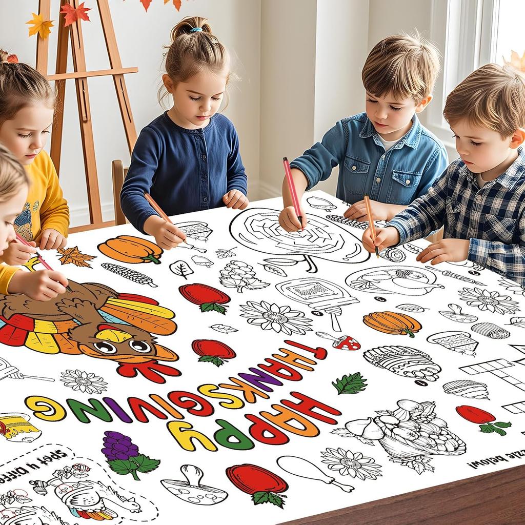 【Exquisite Thanksgiving Elements Design】 - This Thanksgiving coloring table cloth features fall harvest prints, such as turkeys, pumpkins, maple leaves, sunflowers, apples, cakes, honey, and more. It creates a funny game-painting paradise for kids, with the Thanksgiving coloring table cover incorporating DIFFERENCES, WORD FIND, Mazes, GRATITUDE TREE, and CROSSWORD PUZZLE. Suitable for classroom parties and parent-child craft activities, it allows girls and boys to enjoy the colors and fun.
