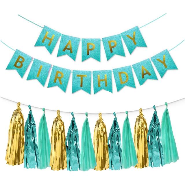 Teal Turquoise Gold Birthday Party Decorations Aqua Mint Birthday Banner Paper Tassel Garland Fringe Streamers for Girls 16th Women 30th 40th 50th