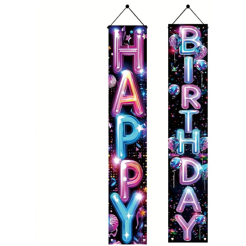 2 Pcs Happy Birthday Door Banner, Neon Lights Theme, Polyester Fabric, Easy to Hang, Indoor/Outdoor Use