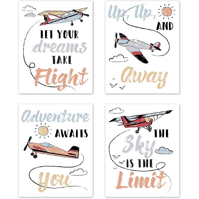 Sweet Jojo Designs Vintage Airplane Wall Art Prints Room Decor for Baby Nursery Kids - Set of 4 - Grey Yellow Orange Red White Blue Airplanes Air — купить товар онлайн с бесплатной доставкой по всему миру!