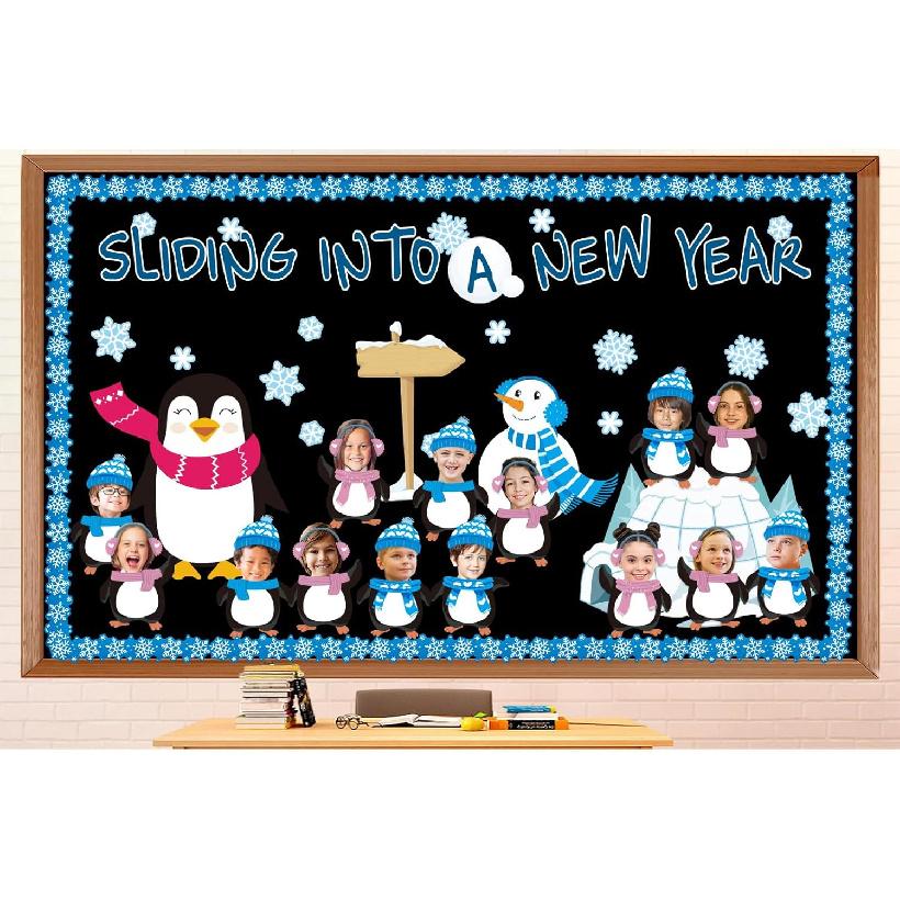 Ctosree 116 Pcs Winter Penguin Bulletin Board Decorations Set Sliding in to a New Year DIY Classroom Photo Wall Decor Snowflakes Penguin Snow Castle