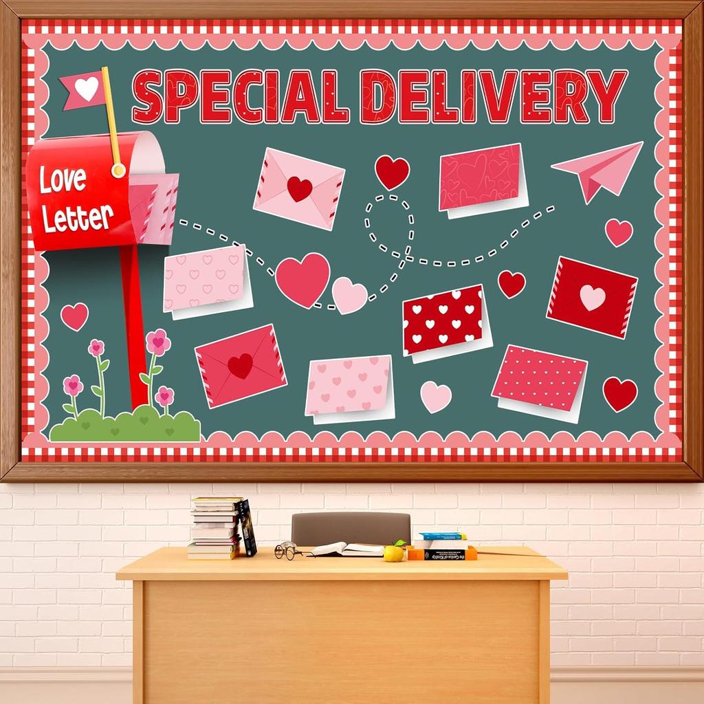 87Pcs Valentine's Day Classroom Bulletin Board Decoration Special Delivery DIY Bulletin Board Set 3D Heart Mailbox Letter Cutouts with Borders for