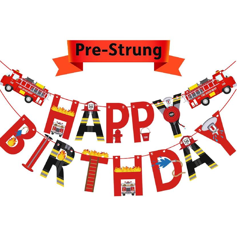 Pre-Strung Fire Truck Happy Birthday Banner Firemen Birthday Party Bunting Banner Flag for Adults Firefighter Party Sign Supplies Fire Engine Rescue