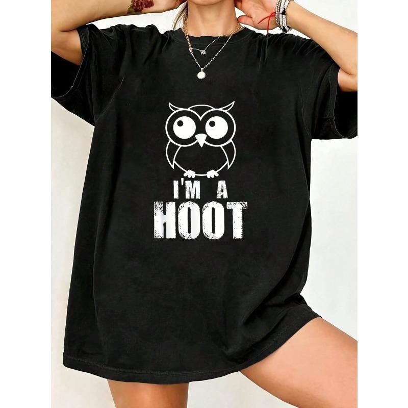 Oversized T-Shirt Black Owl And I M A Hoot Print Casual Wear For Women Summer Outfits Streetwear Fashion