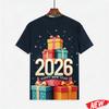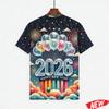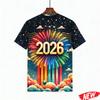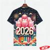 Men's T-shirt with colorful balloon and fireworks pattern, Happy 2026 New Year, short-sleeve holiday party family crew neck T-shirt