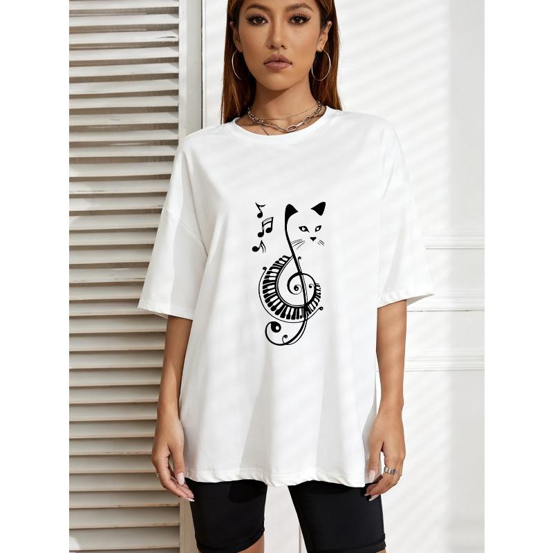 Футболка с круглым вырезом, белая, с принтом кошки, музыкальной ноты и клавиш пианино, повседневная одежда для женщин — купить товар онлайн с бесплатной доставкой по всему миру!