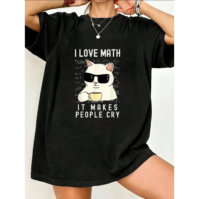 Oversize Women's Short-Sleeve T-Shirt with Sunglasses Cat, Math Formulas & "I LOVE MATH" Text Print