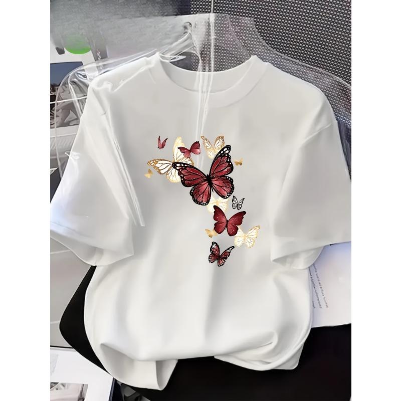 Женская футболка европейского размера с рукавами, ярким принтом бабочки и цветочных букв - Повседневная с круглым вырезом, Весна