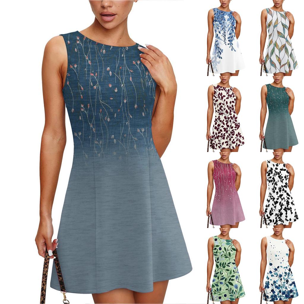 Women's Summer Dress Casual Sleeveless Round Neck Classical Leaf Print Vest Sundress