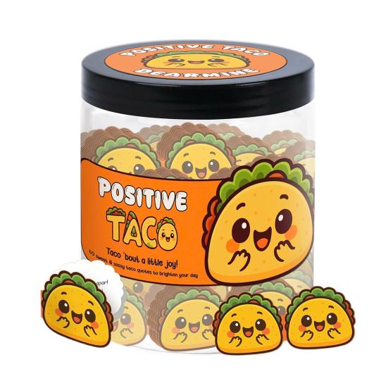 Позитивная банка с тако - это продуманный и вдохновляющий подарок, идеально подходящий для праздников, торжеств и повседневного выражения признательности.. Этот очаровательный кувшин, наполненный 60 короткими, позитивными цитатами, служит долговечным знаком благодарности и поддержки для учителей, коллег, друзей и близких..