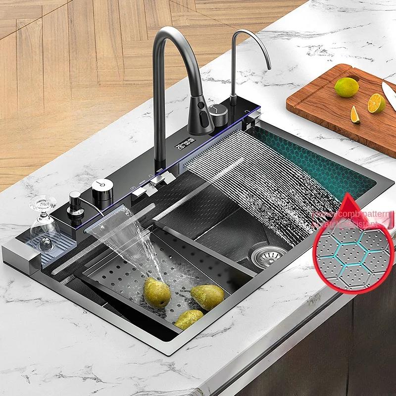 304 Stainless Steel Kitchen Sink with Double Waterfall Faucet Single Slot Integrated Digital Display Soap Dispenser Cup Washer — купить товар онлайн с бесплатной доставкой по всему миру!