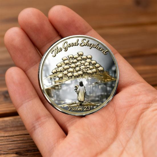Эта памятная монета — глубокий символ веры и ободрения, содержащий значимые элементы: волк символизирует жизненные угрозы, агнец представляет верующих, посох означает руководство, а стадо воплощает общину и обеспечение. Его двусторонний дизайн противопоставляет божественную защиту в невзгодах мирной пастушеской сцене, иллюстрируя Божье руководство от испытаний к миру..