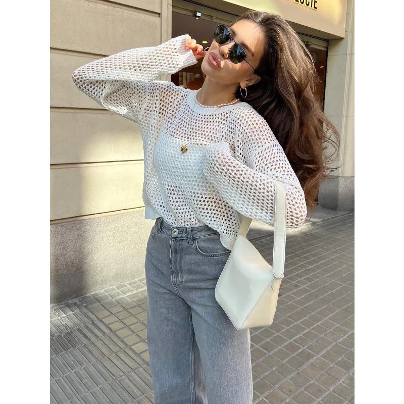 Прозрачный винтажный топ с длинным рукавом, свободные пуловеры, базовая сексуальная футболка для женщин, летний вязаный свитер, женская футболка оверсайз — купить товар онлайн с бесплатной доставкой по всему миру!