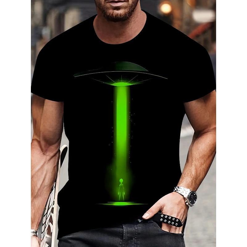 Европейские размеры Мужская черная футболка с принтом - летающая тарелка и инопланетный космический корабль неоново-зеленого цвета - С круглым вырезом, короткий рукав, Машинная стирка — купить товар онлайн с бесплатной доставкой по всему миру!