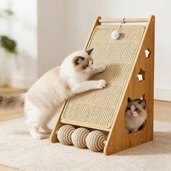 Наклонная когтеточка для кошек Треугольная когтеточка для кошек Сизалевая когтеточка-рампа с пушистым шариком для защиты мебели, дивана для домашних кошек